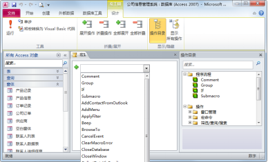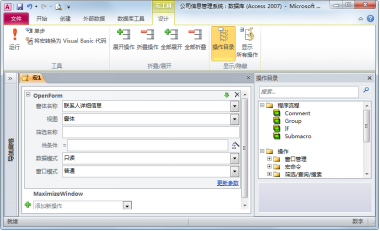 Access2010宏设计窗口提供了70多种基本宏操作,这些基本操作还可以组合很多其它的“宏组”操作。宏命令可以通过窗体中控件的某个事件操作来实现,或在数据库的运行过程中自动实现。像“单击”按钮 、“双击”列表选项这些行为,都是对控件的事件操作。