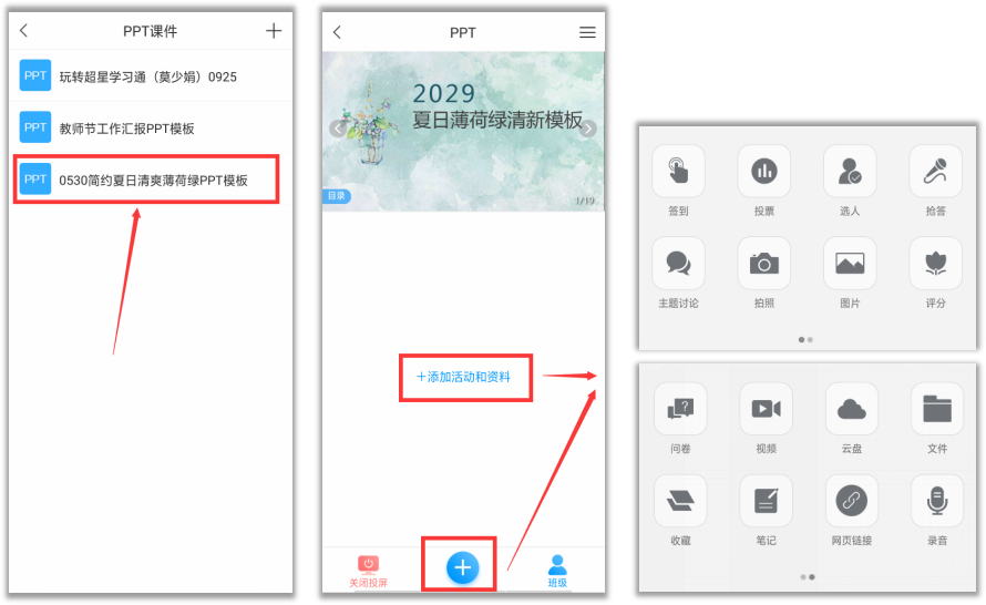 点击“+”,可以在对应PPT下方插入相应活动、资料,在讲到这一页PPT时就可以直接发布、展示到电脑大屏。