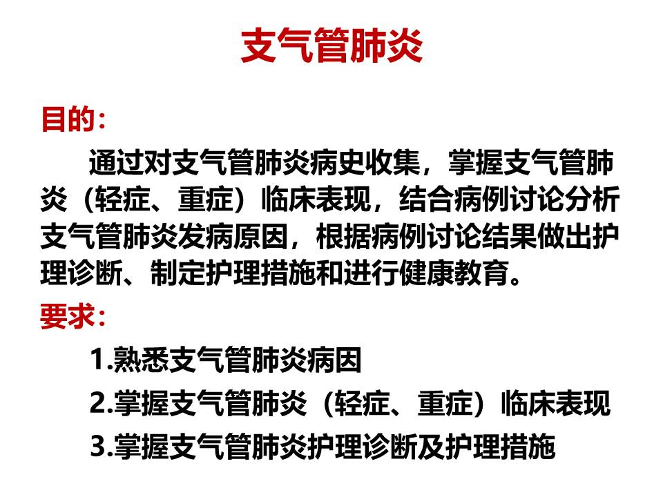通过对支气管肺炎病史收集,掌握支气管肺炎(轻症、重症)临床表现,结合病例讨论分析支气管肺炎发病原因,根据病例讨论结果做出护理诊断、制定护理措施和进行健康教育。