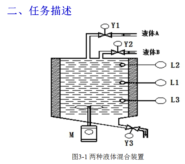 如图3-1所示,利用西门子PLC的S7-200系列设计两种液体混合装置控制系统。在工作之前将容器中的液体放空,按动启动按钮SB1后,电磁阀Y1打开,液体A流入容器。当液位高度达到L1时,液位传感器L1接通,此时电磁阀Y1关闭,而电磁阀Y2打开,液体B流入容器。当液位达到L2时,液位传感器L2接通,这时电磁阀Y2关闭,同时启动电动机M搅拌。1分钟后电动机M停止搅拌,这时电磁阀Y3打开,放出混合液体,当液位高度下降到L3后,再延时5s电磁阀Y3关闭,一个周期结束。重新按下启动按钮SB1开始下一个周期。