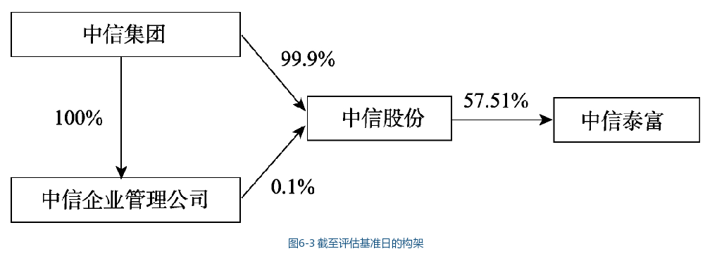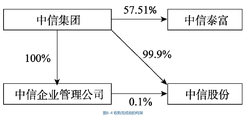(B)股份支付转让对价中的股价对价部分,即人民币17701310.00万元,应由中信泰富按照13.48港元/股(按照股份转让协议规定的调整机制调整)的对价股份单价,并按定价基准日中国人民银行公布的人民币兑港元汇率中间价计算的股份对价总金额(即按1.00港元兑人民币0.79207元计算为约22348163.68万港元),于交割日或之前,向中信集团或其指定的全资附属公司以发行对价股份的方式支付。按照股份对价人民币17701310.00万元计算,于交割日或之前拟发行的对价股份为16578756438股。除建议发行对价股份外,为支付收购之部分或者全部现金对价,中信泰富还建议发行配售股份以筹措现金。配售股份将配发予专业及机构投资者。配售预期与对价股份发行同时完成。收购完成后,中信集团仍为上市规则所指的中信泰富之控股股东,而中信股份公司将成为中信泰富的全资附属公司。截至2014年8月25日,中信集团通过中信盛荣和中信盛星共持有中信股份(更名后)约194亿股,持股比例77.9%。图6-3~图6-5是中信整体上市股权架构演变过程。