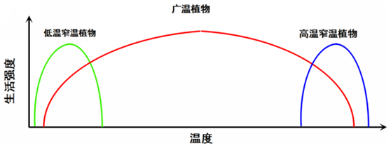 极端温度常常成为制约生物分布的重要因子。平均气温、节律变温、温差、积温、极端温度等多种温度因子的综合作用。植物对温度的生态适应类型分为广温植物,窄温植物,低温窄温植物,高温窄温植物。