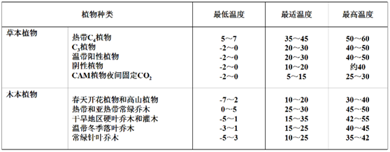 在自然的CO2浓度和光饱和情况下不同植物光合作用的温度三基点(℃)(引自姜汉侨,2004)