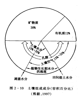 土壤是由固体、液体(土壤水分)和气体(土壤空气)组成的三相复合系统。其中空隙约占50%,土壤空气和水分各占15%~35%。