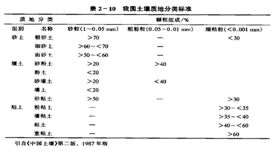 土壤质地又称机械组成,指土壤中各粒级矿质颗粒(砾、砂、粉、粘)的相对重量百分比。