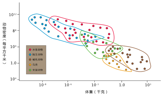 这张不同动物物种密度与身体大小关系图,则证明了所有动物都是遵从“个体大小增加,而密度减小”这一规律。