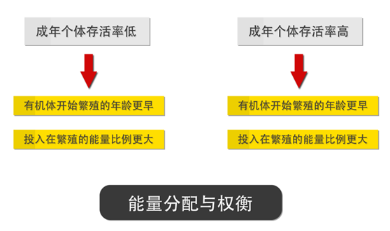 当成年存活率低,生物体开始繁殖的年龄提早,投入更大比例的能量在繁殖上,当成年存活率高,生物体推迟繁殖的年龄,分配更小的能量资源比例给繁殖。