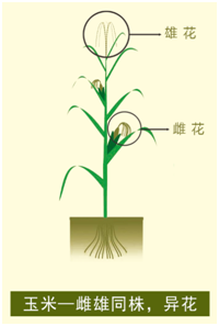 (2)另一类植物种的个体具有雌雄两类花,雄花产生花粉,雌花产生胚珠,是雌雄同株而异花。如玉米