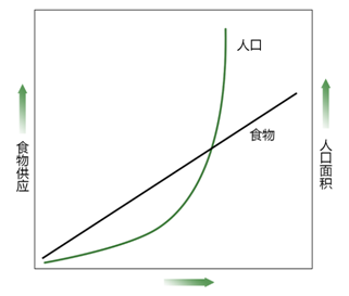 虽然食物供给量随时间在增长,但人类种群数量却呈指数增长。显然,食物与人口的增长捕食平衡关系,人类要获得充足的食物,必然要进行竞争。
