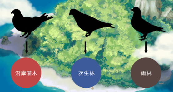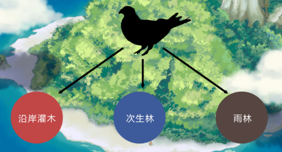 在新几内亚的大岛上,发现3种地鸽,每种都分别处于不同的生境。可在在只有一种地鸽的小岛上,该种地鸽三种生境都可使用。
