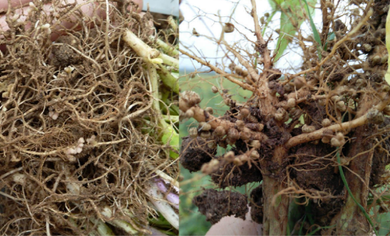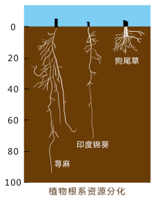这是一张植物根系资源分化,三种不同植物根在同一土壤区域同存。荨麻、印度锦葵、狗尾草