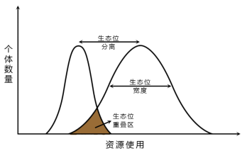 生态位重叠指不同物种的生态位之间的重叠现象。或者说两个或更多的物种对资源位和资源状态共同利用。