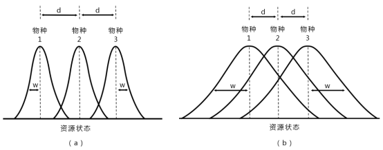 (3)根据竞争与否,分基础生态位和实际生态位,前者包括后者;