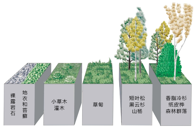 基质的性质不同,演替过程不同。旱生演替主要从裸露岩石(原生裸地)开始,分为以下阶段: