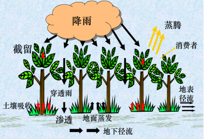 一部分被植物群落截留,通过蒸发返回大气,另一部分到达地表。