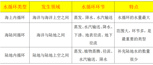 (3)水循环的主要环节:蒸发蒸腾、水汽输送、凝结降水、下渗、径流(地表、地下) 。