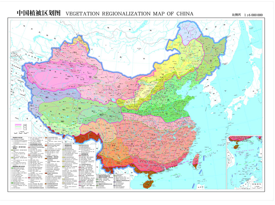 * 从南自南沙群岛,北至黑龙江,跨50多个纬度,由于纬度的差异,从南向北形成各种热量带:热带、亚热带、温带和寒温带。于此相应,在湿润森林区域内,植被类型由南到北顺序为:热带雨林、亚热带常绿阔叶林区、温带落叶阔叶林、寒温带针叶林区。