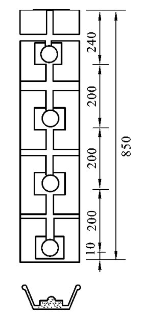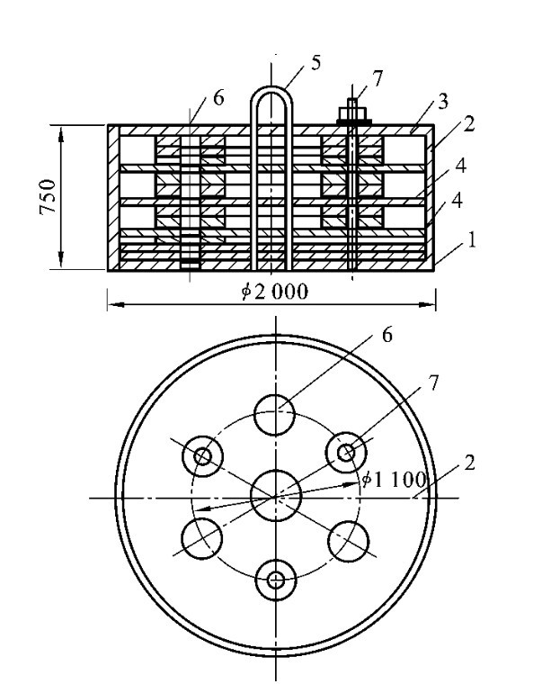 1—30mm厚钢板底板;2—18mm厚钢板外壳;3—6×φ159mm钢管;4—水平钢筋网片φ16@200mm;5—钢筋骨架φ14@400mm;6—φ50mm吊环;7—C30混凝土