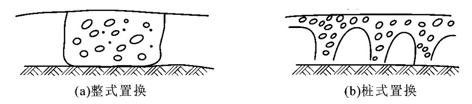 动力置换可分为整式置换和桩式置换,如图10-16所示。整式置换是采用强夯法将碎石整体挤入淤泥中,其作用机理类似于换土垫层。桩式置换是通过强夯法将碎石填筑于土体中,部分碎石桩(墩)间隔地夯入软土中,形成桩(墩)式的碎石桩(墩)。其作用机理类似于振冲法等形成的碎石桩,它主要是靠碎石内摩擦角和墩间土的侧限来维持桩体的平衡,并与墩间土起复合地基作用。