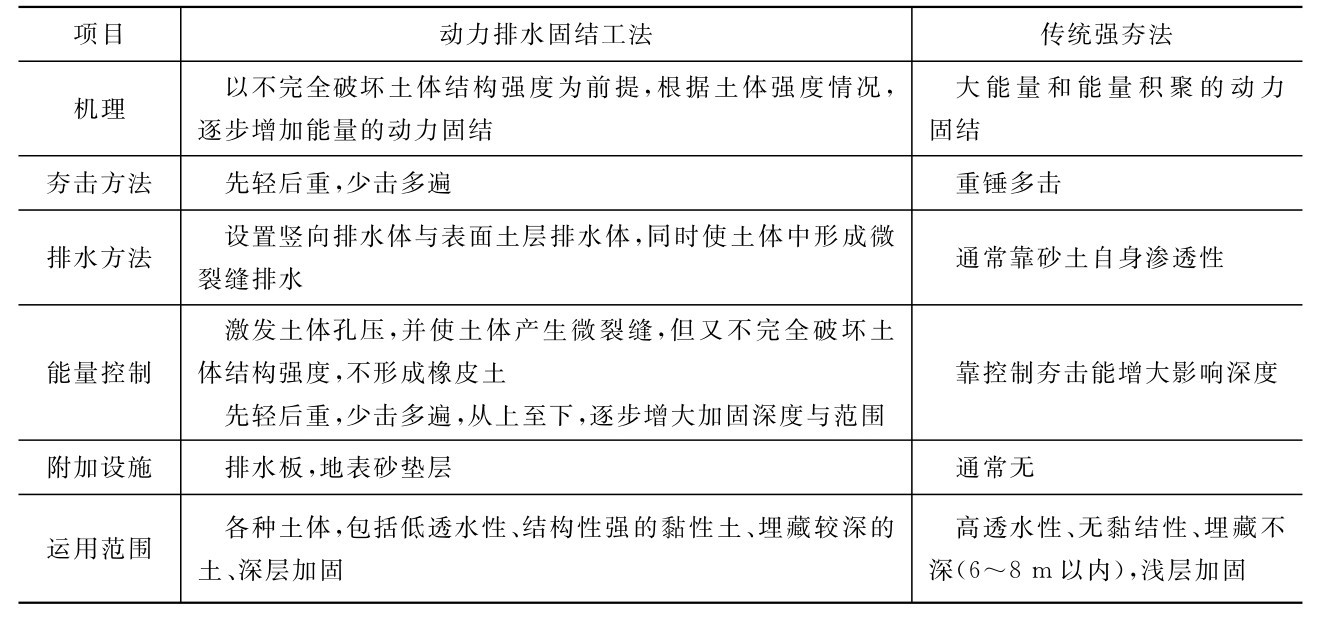 (1)传统强夯法为一种大能量和能量积聚的动力固结方法,采用重锤多击,适用砂性土加固。而动力排水固结工法采用严格控制强夯动力和夯击能,使软黏土中产生的超孔隙水压力不会过快上升,以确保软土不变成“橡皮土”,成功地克服了传统强夯法用于软土的致命弱点。