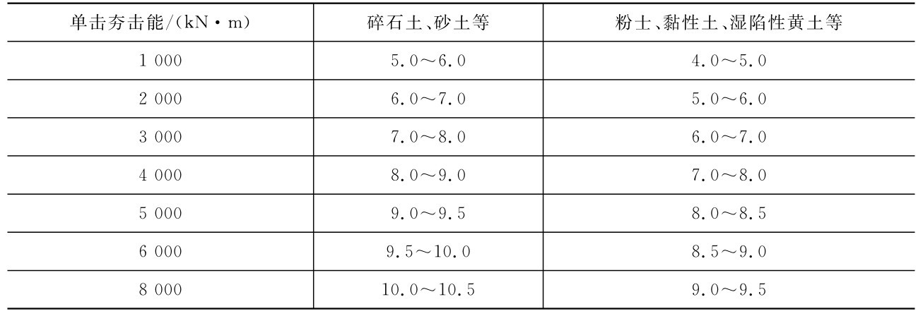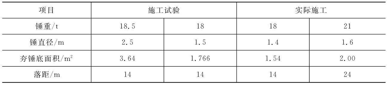 (1)最后两击的平均夯沉量不宜大于下列数值:当单击夯击能小于400kN·m时为50mm;当单击夯击能为4 000~6 000kN·m时为100mm;当单击夯击能大于6 000kN·m时为200mm。