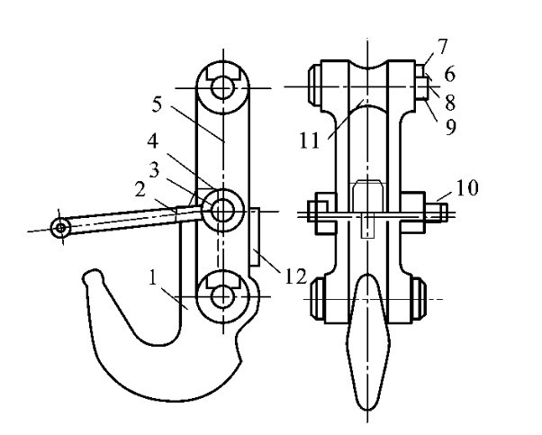 1—吊钩;2—锁卡焊合件;3、6—螺栓;4—开口销;5—架板;7—垫圈;8—止动板;9—销轴;10—螺母;11—鼓形轮;12—护板