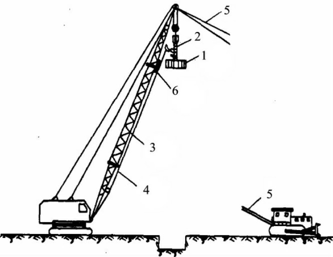 1—夯锤;2—自动脱钩装置;3—起重臂杆;4—拉绳;5—锚绳;6—废轮胎