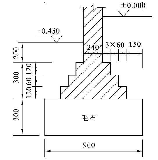 【例7-4】 某砖混结构外墙基础采用毛石基础,墙厚240mm,基底处平均压力pk=100 kPa,室内外高差450mm,设计基础埋深0.8m,设计基础宽度为0.9m,试设计基础的剖面尺寸。