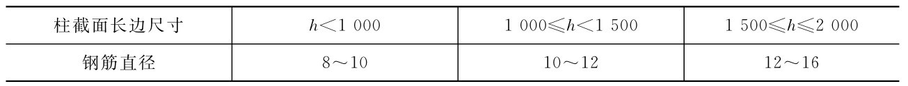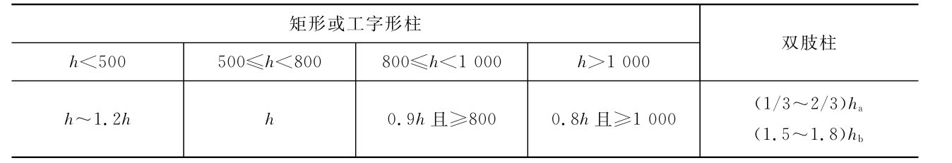 注:(1)h为柱截面尺寸;ha为双肢柱全截面长边尺寸;hb为双肢柱全截面短边边长。