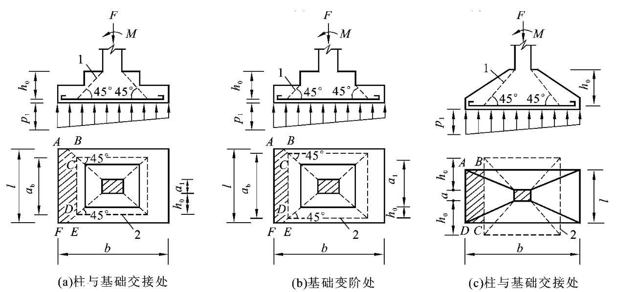 基础应有足够的高度使冲切破坏在基础冲切角锥体以外,由地基净反力产生的冲切荷载Fl应小于基础冲切面上的抗冲切强度。