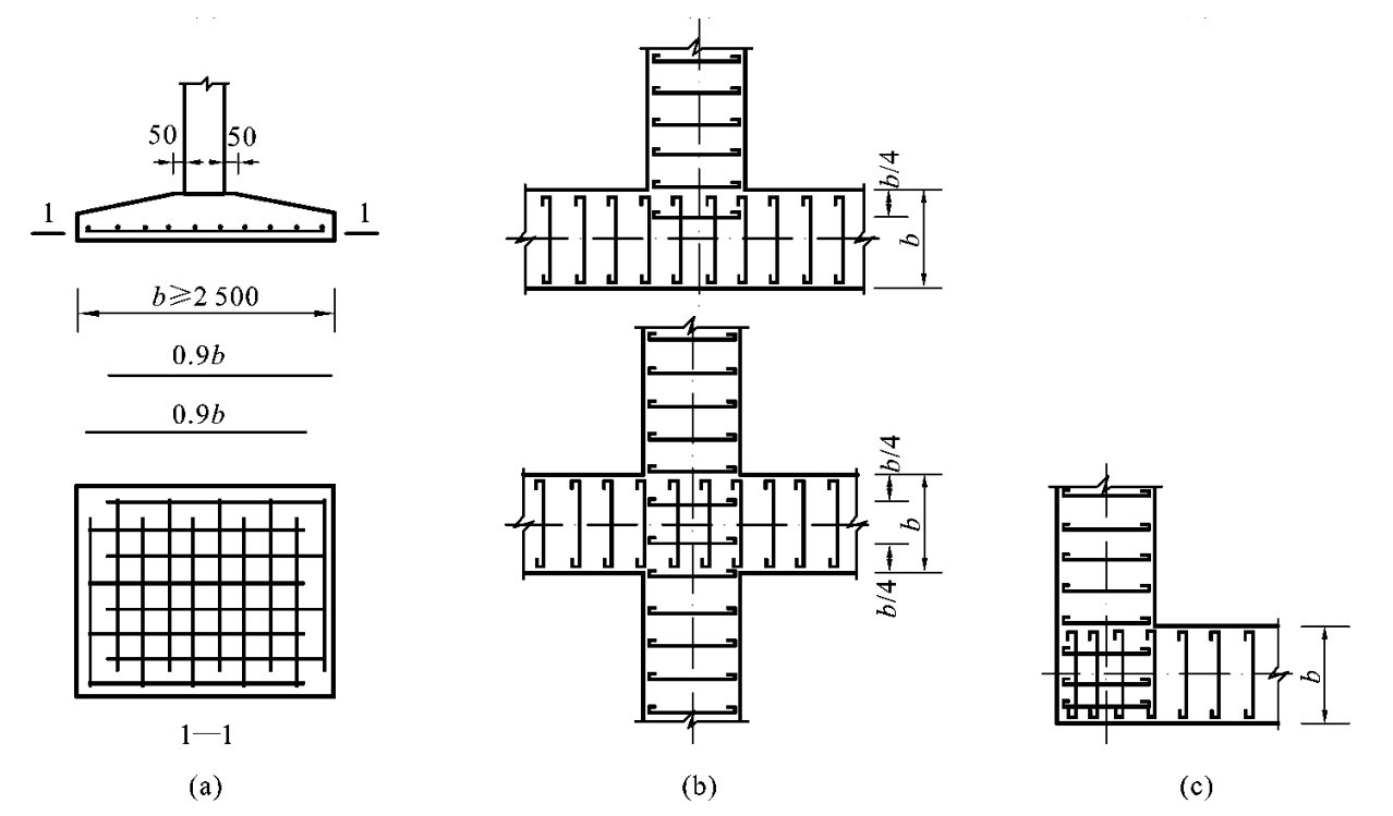 (6)钢筋混凝土条形基础底板在T形及十字形交接处,底面横向受力钢筋仅沿一个主要受力方向通长布置,另一方向的横向受力钢筋可布置到主要受力方向底板宽度1/4处,如图7-18(b)所示。在拐角处底板横向受力钢筋应沿两个方向布置,如图7-18(c)所示。