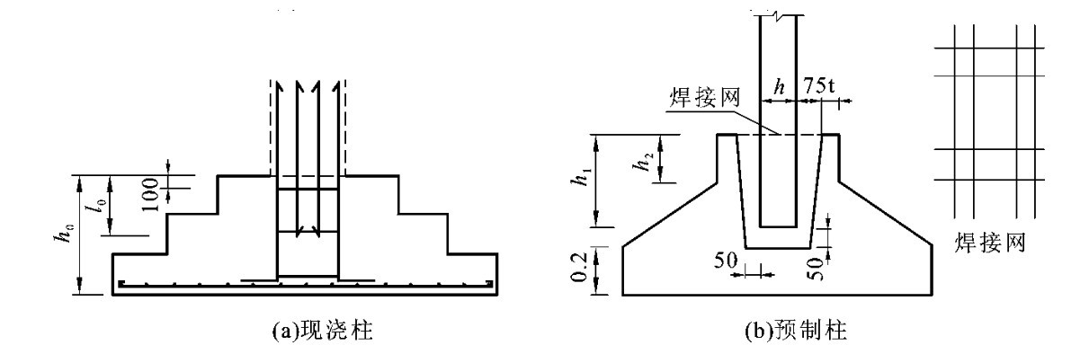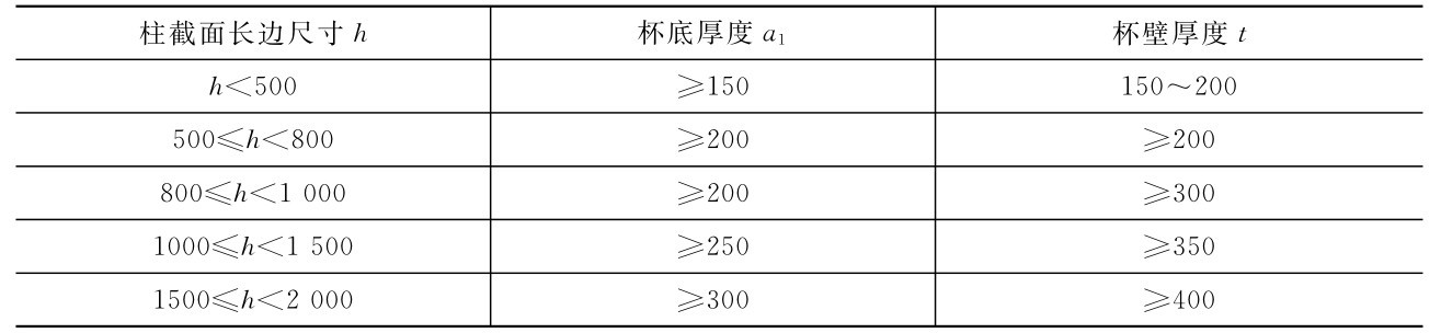 注:(1)双肢柱的杯底厚度值,可适当加大;当有基础梁时,基础梁下的杯壁厚度,应满足其支承宽度的要求。