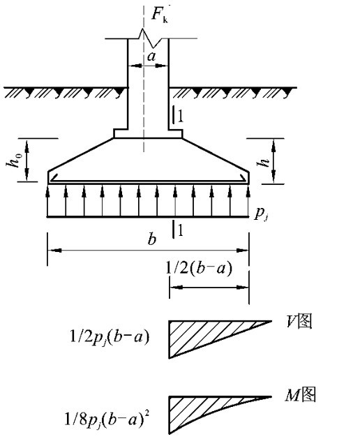 墙下钢筋混凝土基础底板像倒置的悬臂梁,其受力情况如图7-20所示,由于自重G产生的均布压力与由其产生的那一部分地基反力相抵消。所以基础底板主要受到上部结构传来的荷载设计值F引起的地基净反力pj的作用,使基础底板发生向上的弯曲变形,底板任一截面1—1将产生弯矩Mj和剪力Vj。