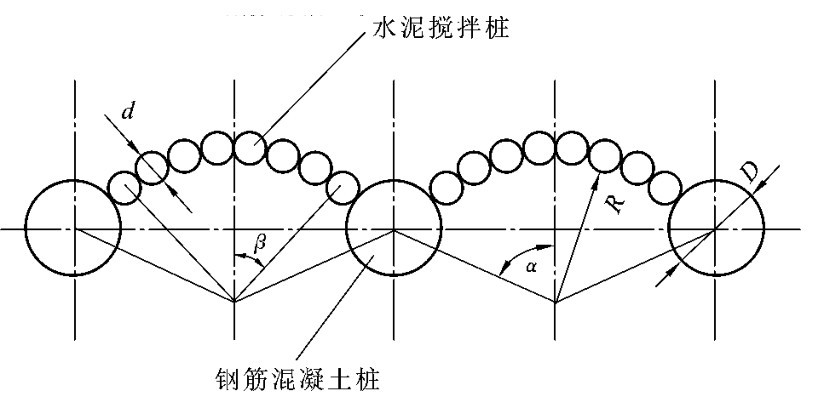 连拱式支护结构通常采用钢筋混凝土桩与深层搅拌水泥土拱以及支锚结构组合而成(见图9-7)。水泥土抗拉强度很小,抗压强度较大,形成水泥土拱可有效利用材料强度。拱脚采用钢筋混凝土桩,承受由水泥土拱传递来的土压力,如果采用支锚结构承担一定的荷载,则可取得更好的效果。