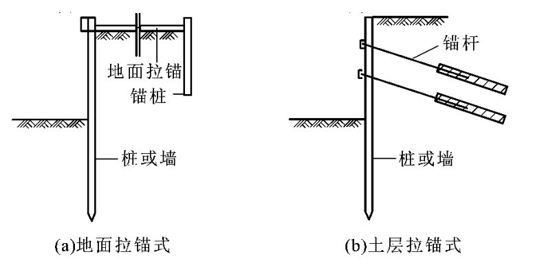 拉锚式支护结构由支护桩或墙和锚杆组成。支护桩和墙同样采用钢筋混凝土桩和地下连续墙。锚杆通常有地面拉锚(见图9-4(a))和土层锚杆(图9-4(b))两种。地面拉锚需要有足够的场地设置锚桩或其他锚固装置。土层锚杆因需要土层提供较大的锚固力,不宜用于软黏土地层中。