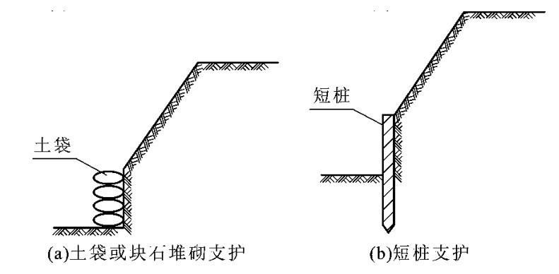 放坡开挖是指选择合理的坡比进行开挖。适用于地基土质较好,开挖深度不大以及施工现场有足够放坡场所的工程。放坡开挖施工简便、费用低,但挖土及回填土方量大。有时为了增加边坡稳定性和减少土方量,常采用简易支护(见图9-1)。