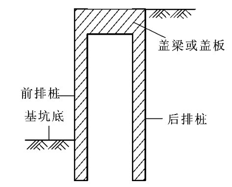 其他支护结构形式有双排桩支护结构(见图9-6)、连拱式支护结构(见图9-7)、逆作拱墙(见图9-8)、加筋水泥土拱墙支护结构以及各种组合支护结构。双排桩支护结构通常由钢筋混凝土前排桩和后排桩以及盖系梁或板组成(见图9-6)。其支护深度比单排悬臂式结构要大,并且变形相对较小。