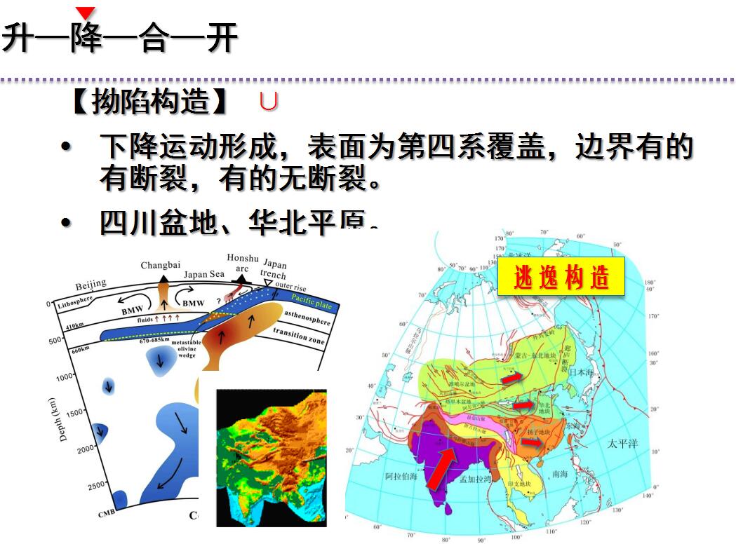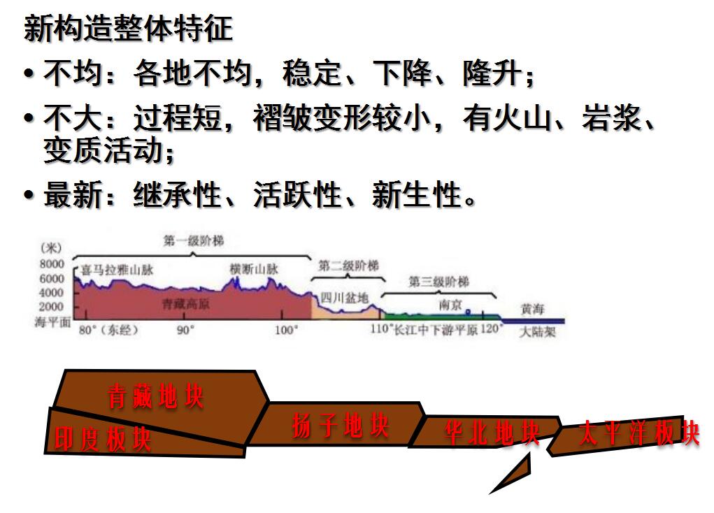新构造运动、新构造、活动构造的概念,新构造的类型及其特征。新构造运动的标志主要有地质构造、地貌、沉积物、地震、火山、水文、地球物理等,不同的标志具有不同的指示意义。中国新构造运动以南北向构造带为界,分为地中海一喜马拉稚新构造域和滨太平洋新构造域,中国新构造运动可分五个时期。新构造运动的研究方法。