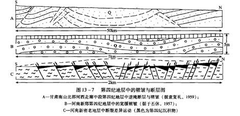 新构造运动形成的构造变形具有一些重要的特征。新构造运动形成的褶皱多比较宽缓,变形比较弱,地层的倾角较小(图13-7),明显不同于老地层中的褶皱。在一些大型强压扭性活断层旁,形成变形比较强烈的褶皱,这些褶皱多不完整,并伴生断裂构造,形成断褶皱,如在新疆南天山的库车坳陷中就非常的发育,那里不仅褶皱变形强烈,而且地层倾角变化也很大。