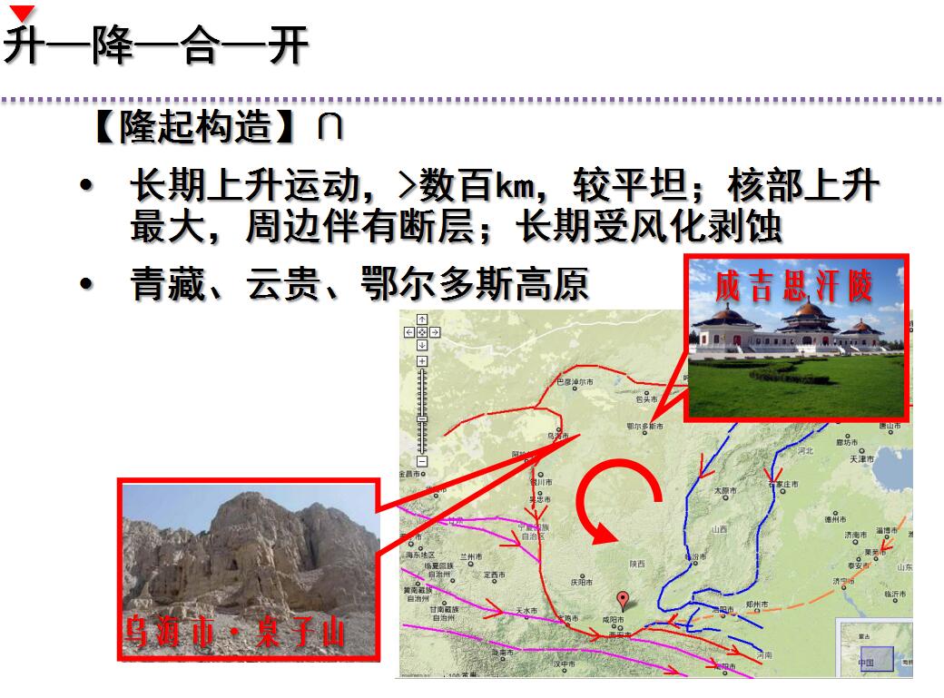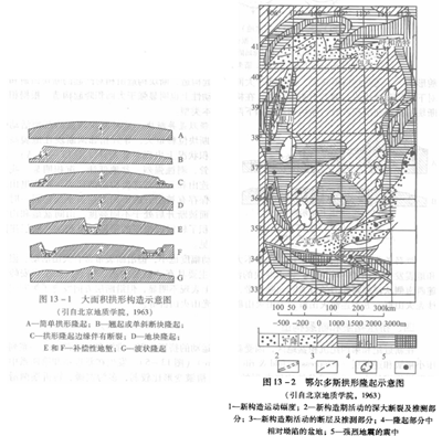 隆起构造(surrectic structure)形成于大区域长期处在上升运动的背景下,它的面积可达数百平方千米或更大。由于是整体的抬升运动,因此隆起构造内部的差异性很小,地形相对比较平坦,但通常核部上升幅度最大,在几百米或千余米,甚或更大。例如外贝加尔山地中广大陆地地区的巨大背斜隆起。在隆起的边缘部分,常常伴有正断层,有时发育逆断层。根据新近纪一第四纪地层面或山地大范围夷平面的变形和变位分析,这类构造有的在核部有补偿性地堑,有的则呈单斜状隆起等(图13-1)。中国的鄂尔多斯高原是一个周边有断裂伴生的典型拱形隆起构造例子(图13-2)。