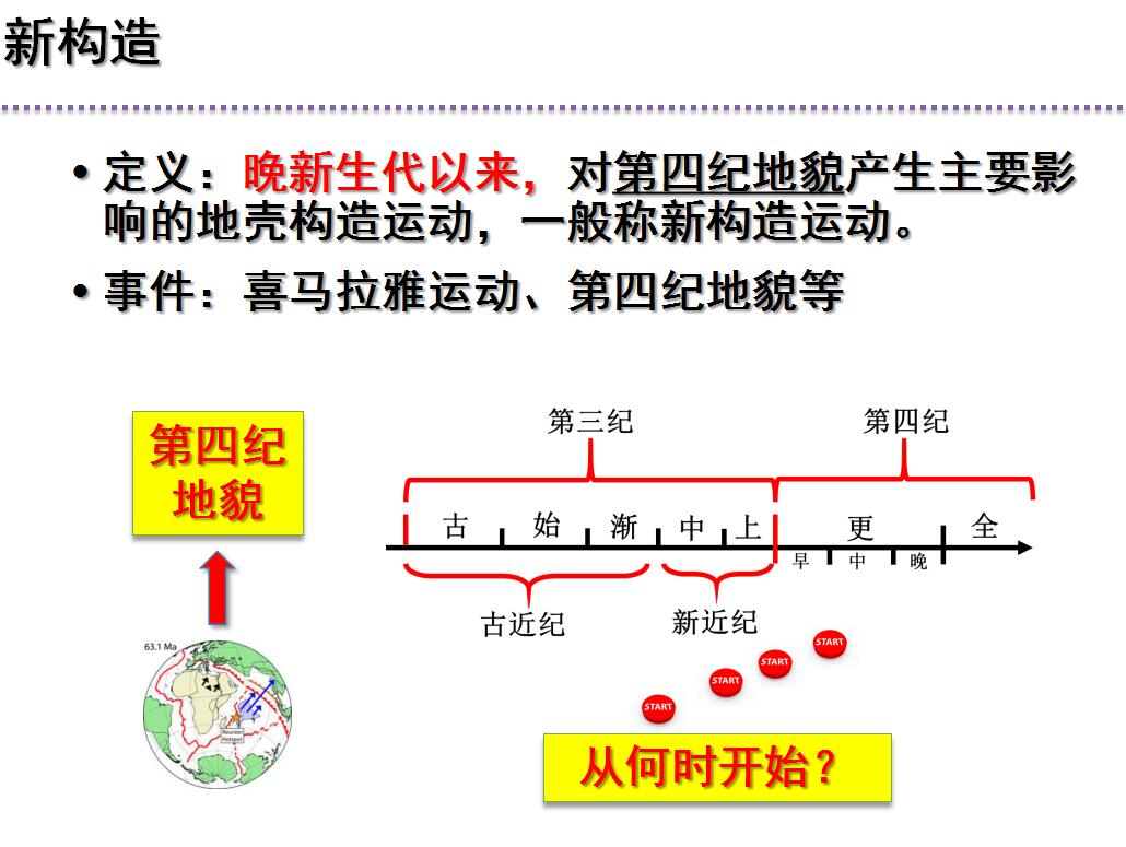 现今的大量研究表明,第四纪时期的构造运动十分强烈,并控制了第四纪古地理和古气候的演化,同时也影响到生物分布的变化。与第四纪构造变动相关的概念主要是新构造运动和活动构造。、新构造运动与新构造