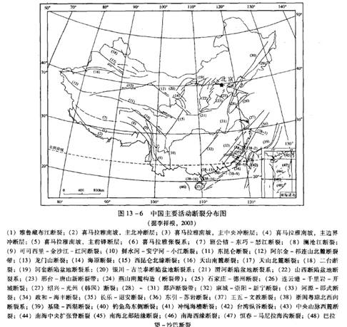 中国不仅活动断裂非常发育(图13-6),上以南北带(贺兰山一龙门山一小江断裂带)而且活动性很强,常导致大地震的发生。基本为界,我国的东、西部的活动断裂的活动特征不同。在西部地区,受印度板块向北推挤的作用,青藏高原的东缘向东逃逸,形成一系列以逆冲、逆掩为主的近EW向断裂和NWW-NW , NEE-NE向逆冲左行走滑的大活动断裂带,同时发育了规模较小的近SN向的正断层或正走滑断层和NWW-NW向走滑断层的组合为特征。在东部地区,受太平洋板块俯冲的影响,以NNE-NE和NW向的张性活动和走滑活动为特征,活动强度低于西部,断层位移速率为5 mm/a以下。东南沿海大陆边缘活动断裂,自台湾往福建、广东方向由NNE走向逐渐转为NE-NEE走向,断裂以左旋走滑正断裂为主。而与其共辘的NW向断裂多为正断层或正走滑断层,但规模较小,延伸不远。