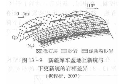 在我国西部地区,从上新世到第四纪,沉积物的岩相发生了显著的变化。在上新世,青藏高原及其周边地区,湖泊相沉积非常发育,以粉砂岩、砂质泥岩、砂岩为主,而进入第四纪(早更新世),沉积了一套山麓相的砾石层(西域组),与下伏地层形成鲜明的对比(图13-9)。这一岩相的变化反映了在上新世末期,新构造运动明显加强,青藏高原发生了快速隆升,地形起伏加大。