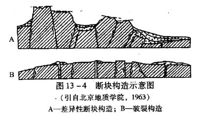 断块构造(block tectonics)是指新构造运动产生的盆、岭相间的构造地貌形态。无论从地貌形态上,还是构造形式上,都不同于大面积隆起构造,断块构造由相对凸起的断块山地和相对下凹的盆地构成,两者为断裂分割,在构造活动性上也明显强于大面积隆起构造。根据相邻断块的高度和沉积差异,断块构造有如下两种基本类型。
