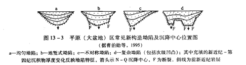 坳陷构造(Depression structure )·是在大区域长期下降运动的背景下形成的,方向与大面积隆起相反。这类构造的地貌多为盆地或平原,表面为第四系覆盖,通常沉积了比较厚的新近系一第四系,因此可通过分析平原或盆地新近纪一第四纪沉积厚度等值线或被上述地层掩埋的古地形面起伏来判别。根据对大多数平原或盆地沉积物厚度变化的研究,这类构造边部界线的类型比较复杂(图13 -3),两边无断裂发育(图13- 3a),两边都有伴生断裂(图13-3b),只有一边发育断裂(图13-3c)。在垂直断裂方向上沉积厚度变化大,基底起伏不平,有的沿断裂一侧沉积物很厚。在一些平原区,受基底断裂活动的影响,可形成次一级的凹凸区(图13-3d),如北京平原区。