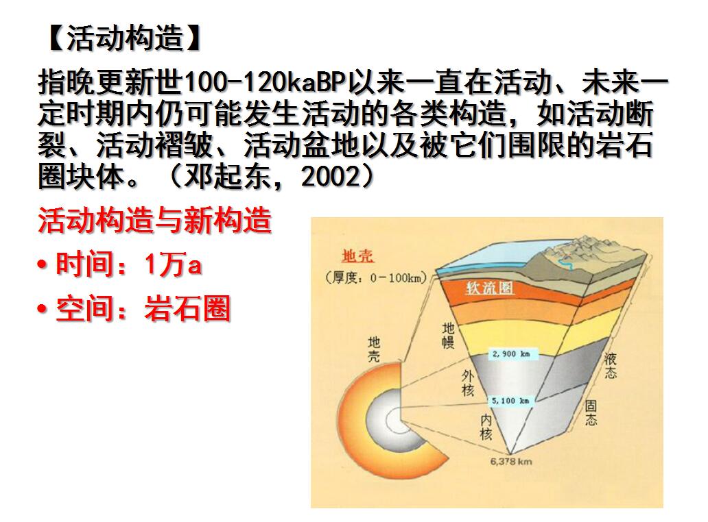 活动构造(active structure)属于新构造的范畴,或者说是新构造的一个分支,这个概念是在研究地震的过程中提出的。在分析地震发生机理时,发现地震的发生与一些在晚第四纪乃至现今活动的断裂关系密切,这些断裂的活动性在时间上不等同于新构造,对它们的研究更具有非常重要的实际意义,因此就提出了活动构造的概念。