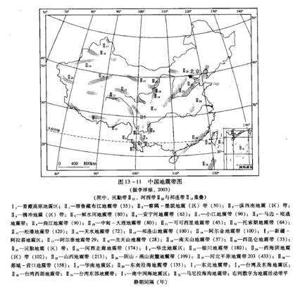 由于地震活动是最新构造运动的表现,因此李祥根(2003)参考国家地震局(1981)地震区划工作,着重考虑了现代地球动力学机制、新构造运动特征、新构造断裂(层),尤其是最新断裂构造带的展布和深部地质构造特征,将中国大陆及海域划分为7个地震区和32条全新世以来有明显活动的,以断裂带为主要依据的地震带(图13-11)。