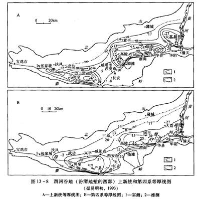 新近纪一第四纪沉积物厚度明显受新构造运动控制。在新构造运动下降区,尤其是地堑构造区,新近纪一第四纪沉积物厚度巨大,如汾渭地堑(图13-8)。沉积区与剥蚀区的相对高差和两者之间的距离对沉积物的厚度也有影响,两者之间高差越大,距离越近,那么在沉积区形成的沉积厚度就越大。其实剥蚀区与沉积区的地形高差受新构造运动的控制,所以新近纪-第四纪沉积物的沉积速度与厚度,在一定程度上代表了新构造运动的速度与幅度。沉积物突然变薄或变厚,可能与断裂活动有关。