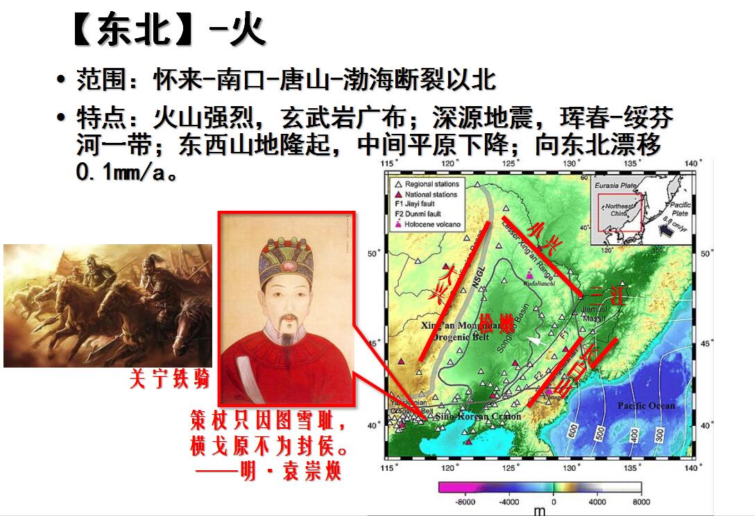 本区新构造运动的最大特点是火山活动强烈。区内古近纪、新近纪、第四纪火山喷发频繁,玄武岩广泛分布。地震活动相对较弱,且震源较深,挥春、绥芬河一带是中国大陆惟一的深源地震区。在地貌特征和新构造活动方面表现为东、西部隆起山地和其间下降平原。上新世以来,东西部山地上升幅度为500~700m,而中间平原最大下降幅度为100m,而南面的下辽河地区最大下降幅度达400余m。区内地壳厚度东、西部分别为36km~38km左右,中间最薄处为30~ 34km。该区受来自地中海一喜马拉雅构造带的应力作用已经很小,仅以0. 50. 1 mm/a的速率向东北方向移动。