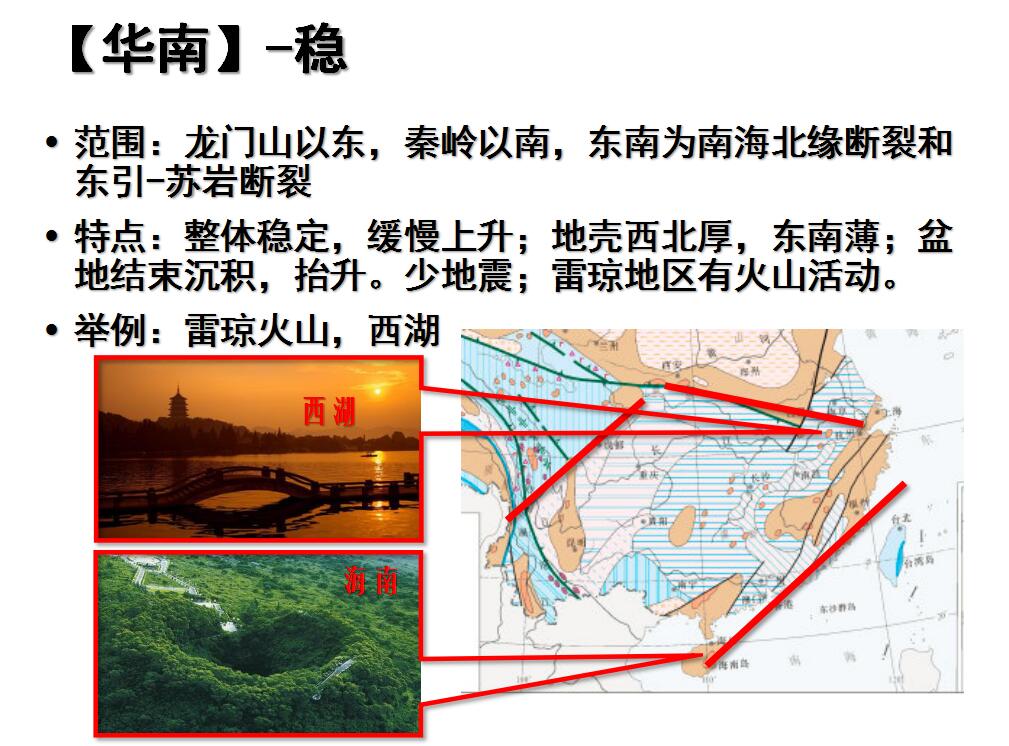 该区的新构造运动表现为相对稳定,以整体缓慢上升为主。地壳西厚东薄,北厚南薄。四川盆地亚区和秦岭一大别山亚区地壳厚度为37 -40km,东海大陆架部分地壳厚度仅26km。新近纪以来,除了江汉一洞庭盆地、南阳盆地及沿海港湾沉积盆地仍有沉积外,大多数盆地均已结束沉积。抬升幅度一般为几百米,最大幅度可达1000m,最大沉降幅度不过200m。雷琼地区新构造时期火山活动具有多期次(幕)间歇活动特征,福建闽西、明溪地区火山活动持续到中更新世。本区很少发生5级以上地震,为少震、弱震区。历史时期泉州地震(1604年,8级)、南澳地震(1918年,7. 2级)、海口地震(1605年,7. 5级)等均沿该区东南边缘的断裂构造带发生。